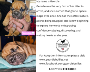 As a young bulldog puppy, Geordie will go through all the typical bulldog baby behaviours: bursts of playfulness, clumsy curiosity, and plenty of mischief. Like all bulldog pups, she’ll need consistent boundaries and training from day one to help her grow into a well‑mannered, confident adult.